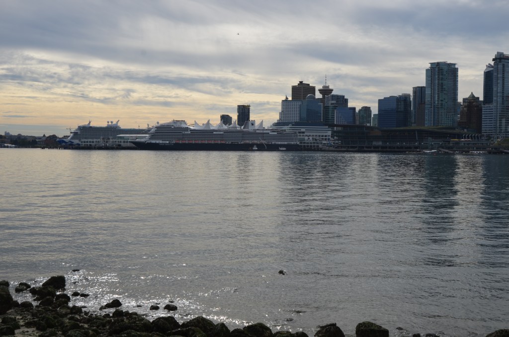 After our lunch, we headed back into Gas Town and to the steam clock, which always has many people just stood and looking at it…. me included. Then we continued and walked round the impressive Canada Place, which is always a hive of activity, and it was today, as a huge cruise ship was in the port and ready to depart. In fact, as we walked further around towards Coal Harbour, we sat on a bench and watched it gracefully set sail for Alaska. That must be an incredible cruise and one that we are contemplating.